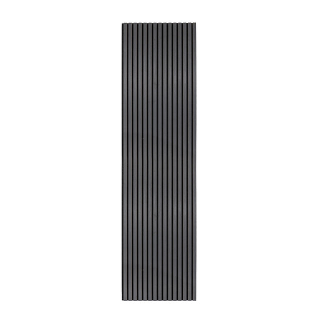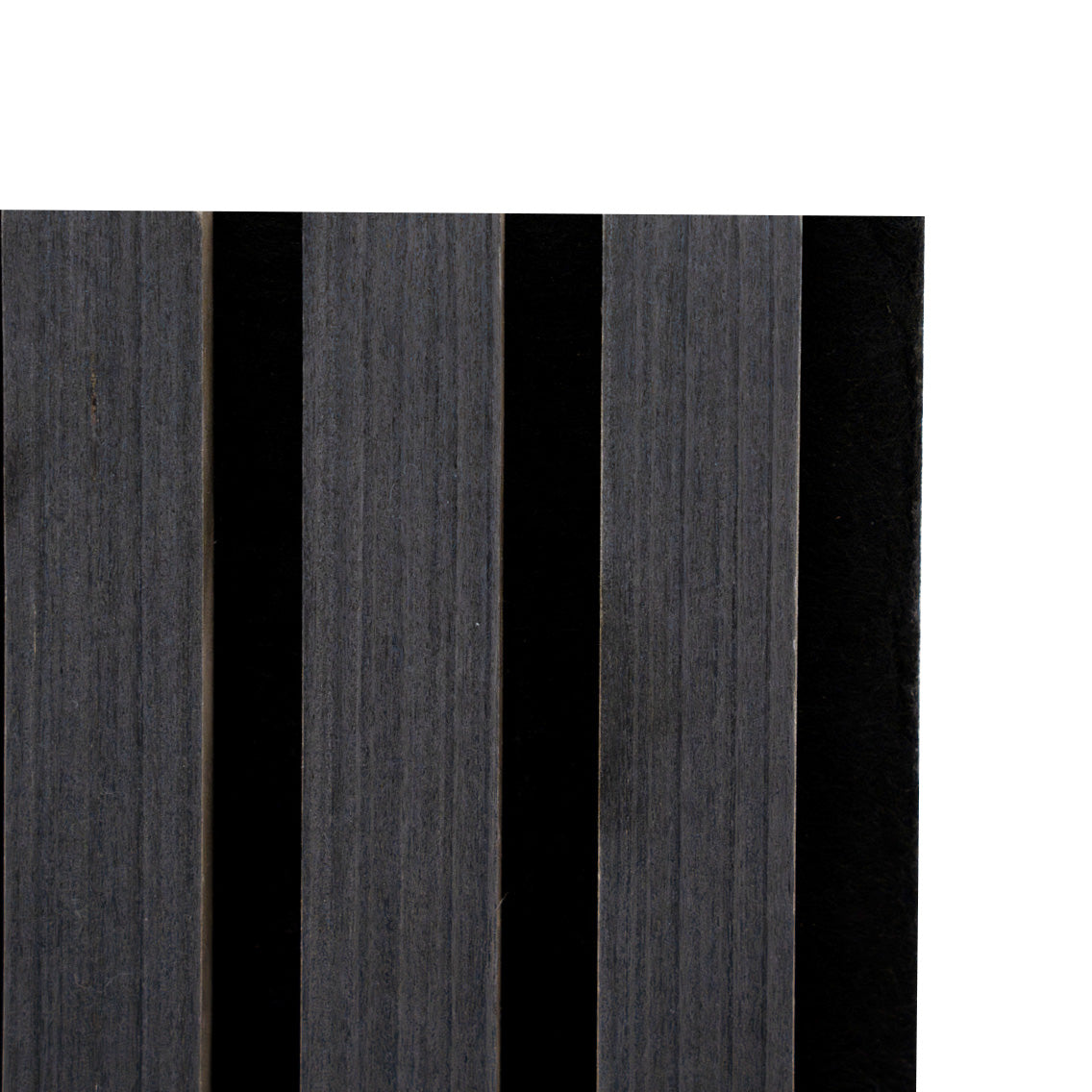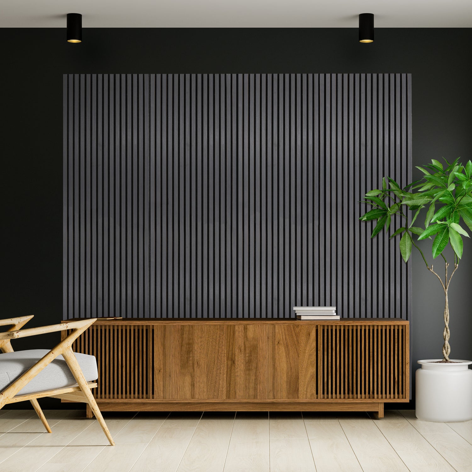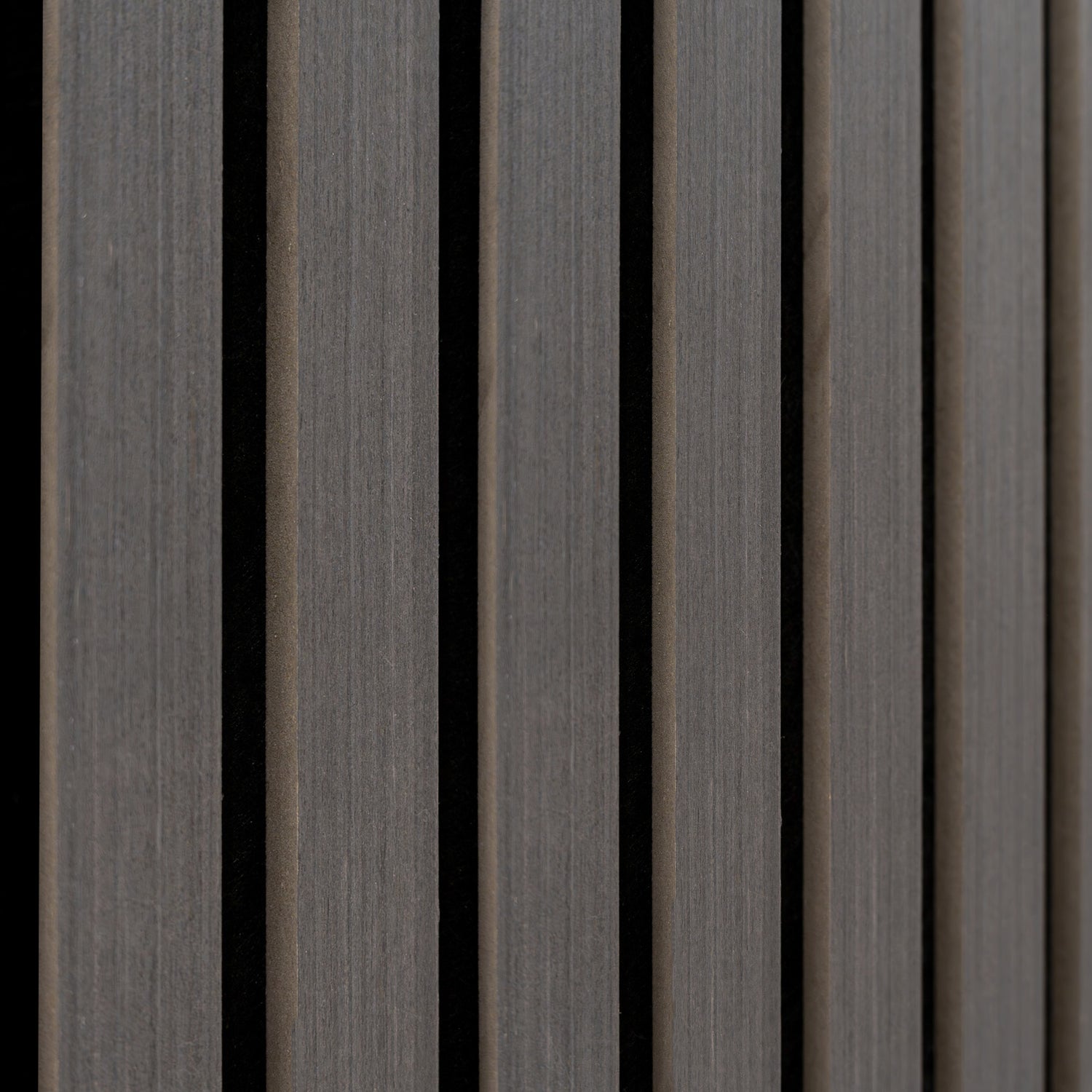 Mit höchster Präzision gefertigt, bestehen die Lamellen aus robustem MDF mit einer hochwertigen Furnierbeschichtung, die den warmen, zeitlosen Charme von natürlichem Anthrazitgrau authentisch nachbildet. Jede Lamelle ist mit einer 9 mm dicken Filzrückseite kombiniert, die nicht nur effektiv Schall reduziert, sondern auch schwer entflammbar ist – für zusätzliche Sicherheit. Die einzelnen Lamellen sind 27 mm breit und 12 mm tief, mit einem gleichmäßigen Abstand von 13 mm, was ihnen ein modernes, harmonisches Erscheinungsbild verleiht, das sich nahtlos in jede Einrichtung einfügt. Dank der sorgfältig ausgewählten Materialien überzeugen die Paneele sowohl optisch als auch in puncto Langlebigkeit.