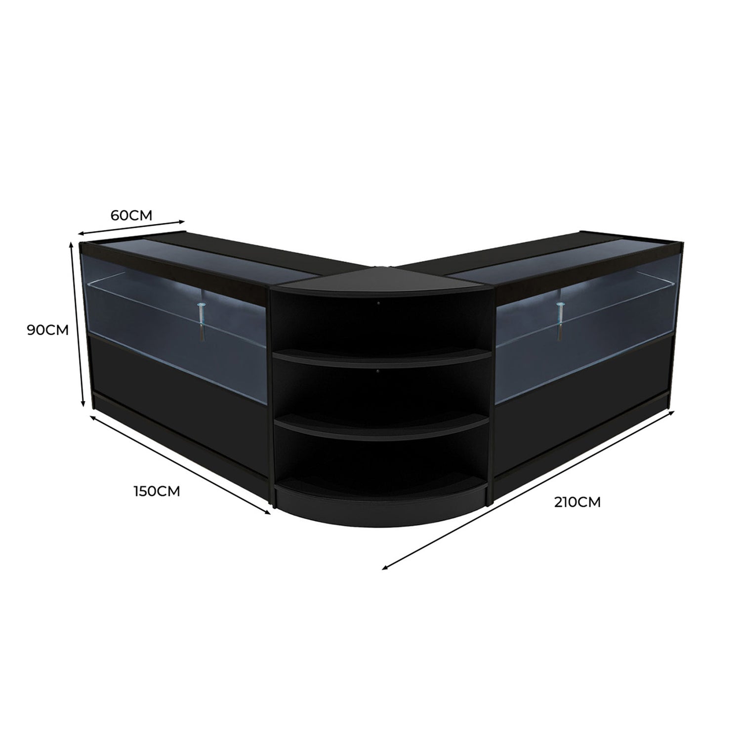 Verleihen Sie Ihrem Verkaufsraum mit diesem hochwertigen Theken-Set, bestehend aus zwei C1500 LED Präsentationstheken und einer LM60 gebogenen Ecktheke, den perfekten Mix aus Stil, Funktionalität und Layout-Flexibilität – ideal für moderne Einzelhandelsumgebungen.