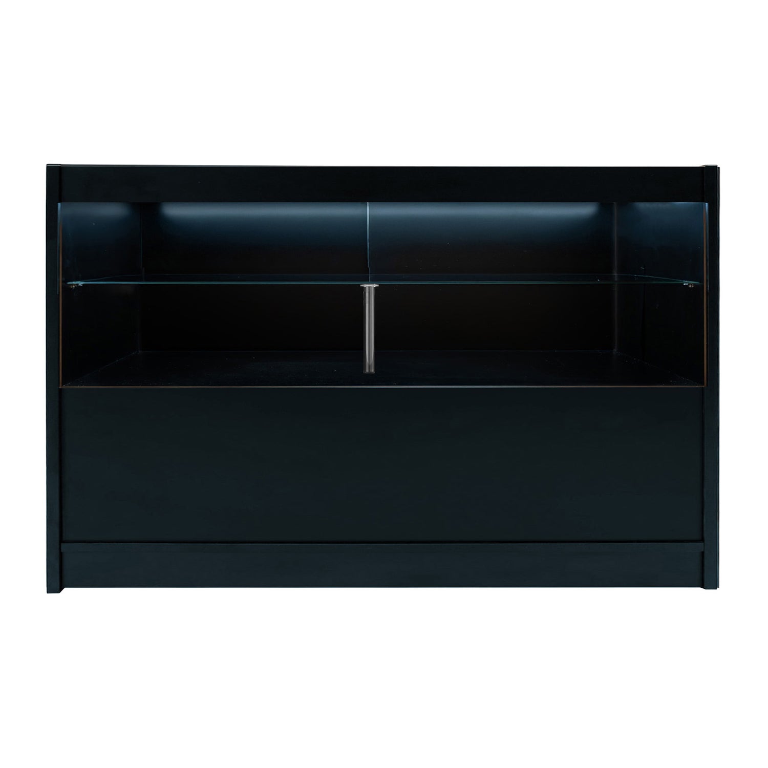 Die C1500 LED Verkaufstheke bietet eine elegante und zeitgemäße Präsentationslösung, die beeindruckende visuelle Wirkung mit praktischer Alltagstauglichkeit verbindet. Ausgestattet mit hellem, weißem LED-Licht sorgt sie für optimale Produktbeleuchtung und zieht Kunden auch bei schwächerem Umgebungslicht an. Mit zwei Präsentationsregalen und einem geschlossenen Regal schafft die C1500 den idealen Kompromiss zwischen sicherer Lagerung und ansprechender Produktpräsentation. Abschließbare, hintere Schiebetüren schützen Ihr Inventar und bewahren gleichzeitig eine saubere, aufgeräumte Optik zur Kundenseite hin. Ob Schmuck, Accessoires oder hochwertige Waren – die C1500 ist ein eleganter und professioneller Blickfang für Ihr Geschäft.