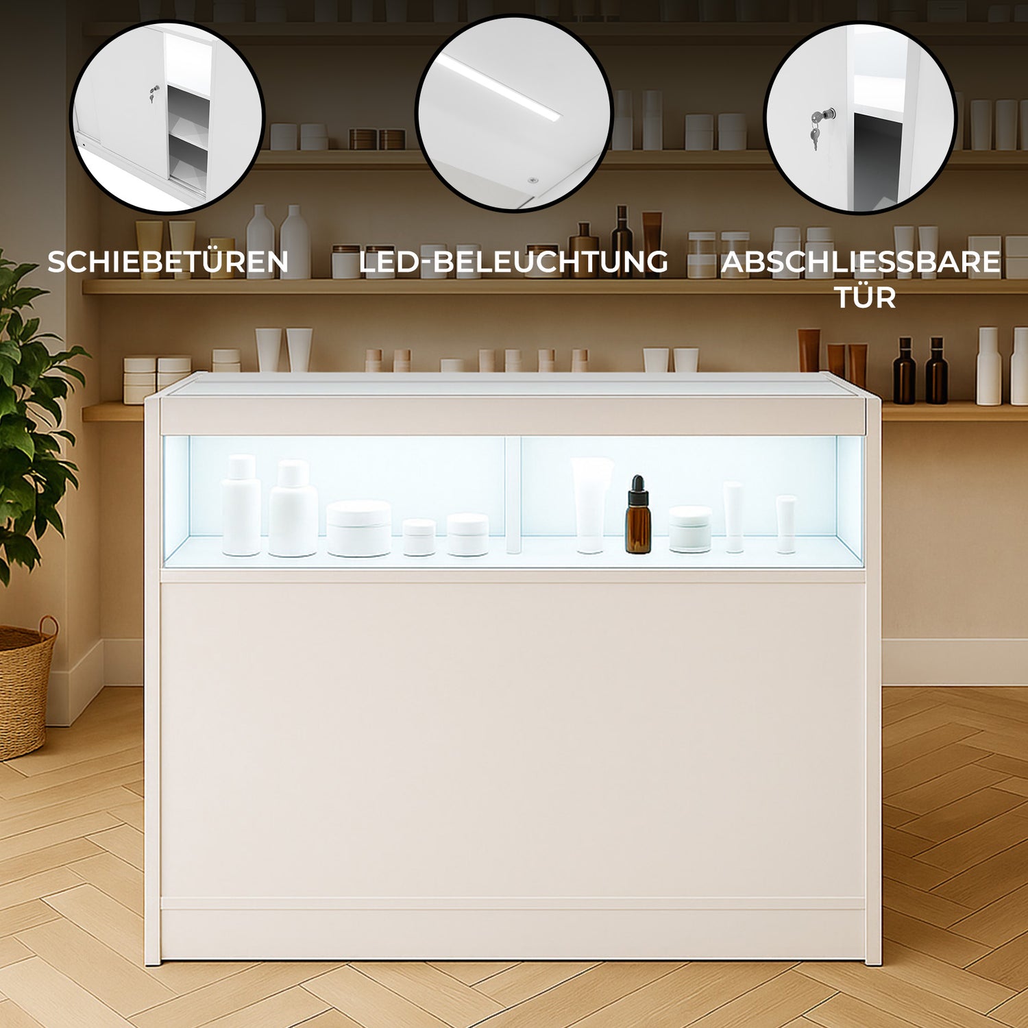 Gefertigt aus hochwertigem MDF mit robuster Melaminbeschichtung und gehärteten Glasplatten, ist die B1200 Theke für den dauerhaften Einsatz in stark frequentierten Verkaufsbereichen konzipiert. Die helle, weiße LED-Beleuchtung sorgt für einen klaren, professionellen Glanz, der Ihre ausgestellten Produkte auch bei schwacher Beleuchtung optimal zur Geltung bringt. Das schlichte, weiße Äußere unterstreicht den hochwertigen Look und macht die Theke zu einem stilvollen Element in modernen und klassischen Ladendesigns.