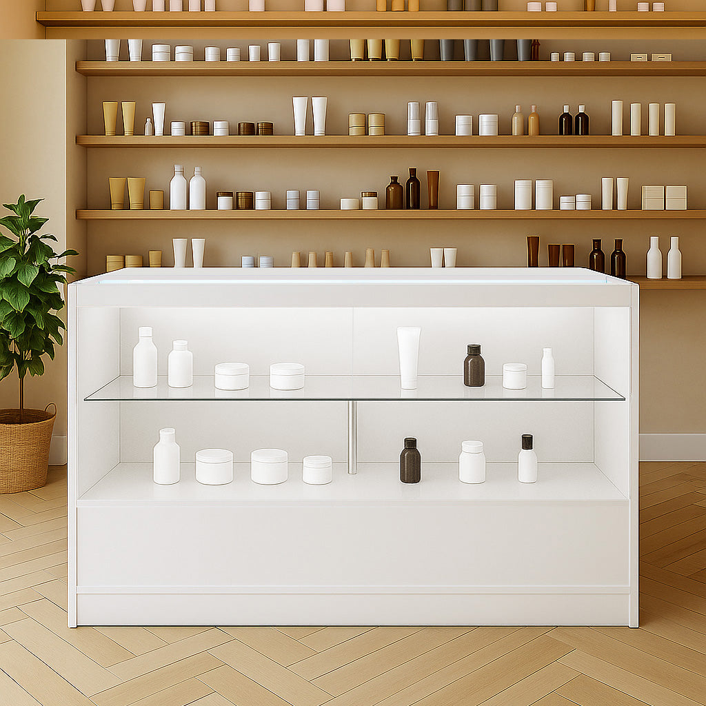 Die C1500 LED Verkaufstheke ist ein zuverlässiges, optisch ansprechendes Möbelstück, das Ihre Waren ins beste Licht rückt und einen professionellen Blickfang im Einzelhandel schafft. Ob feiner Schmuck oder sorgfältig ausgewählte Modeaccessoires – dieser Tresen ist die stilvolle Lösung, die Funktionalität mit Eleganz vereint.