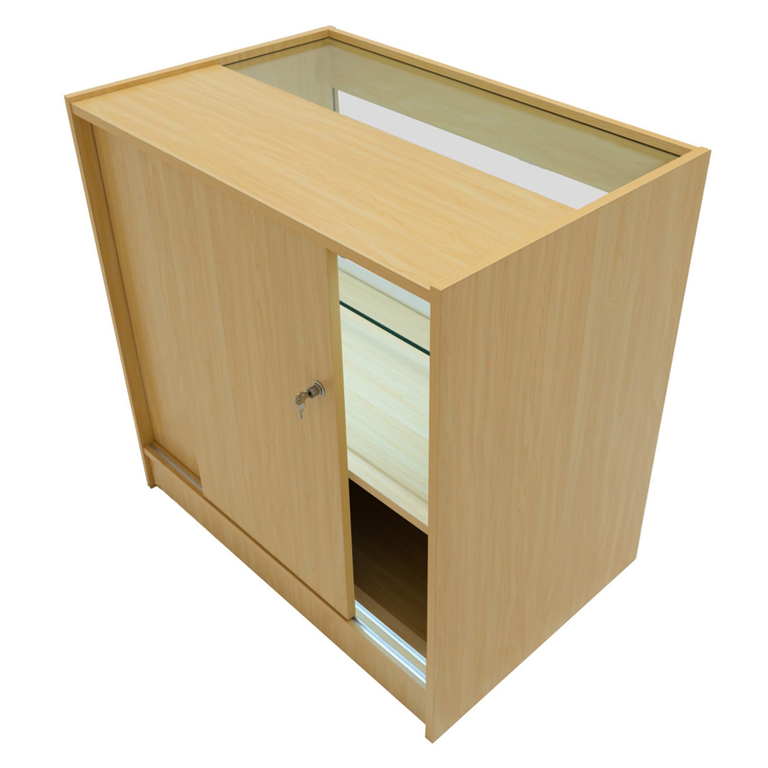 Alle Theken bestehen aus hochwertigem MDF mit strapazierfähiger Ahornfarbiger Melaminbeschichtung, was für Langlebigkeit und ein einheitlich modernes Erscheinungsbild sorgt. Die gehärteten Glaselemente der C900 sorgen für eine elegante Note in den wichtigsten Präsentationsbereichen.