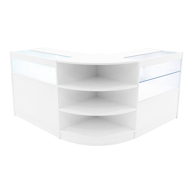 Die LM60-Ecktheke mit geschwungener Form bietet platzsparende Funktionalität und eine fließende Anordnung für Ihren Verkaufsbereich. Ihr kompaktes, gebogenes Design erlaubt eine nahtlose Integration in Ecken oder eine Verbindung mit geraden Theken, um ein zusammenhängendes Thekensystem zu schaffen. Die LM60 verfügt über drei offene, kundenseitig ausgerichtete Präsentationsregale, die die Sichtbarkeit und Erreichbarkeit der Produkte maximieren – ideal zur Aufwertung von Ecken, ohne das Layout zu beeinträchtigen.