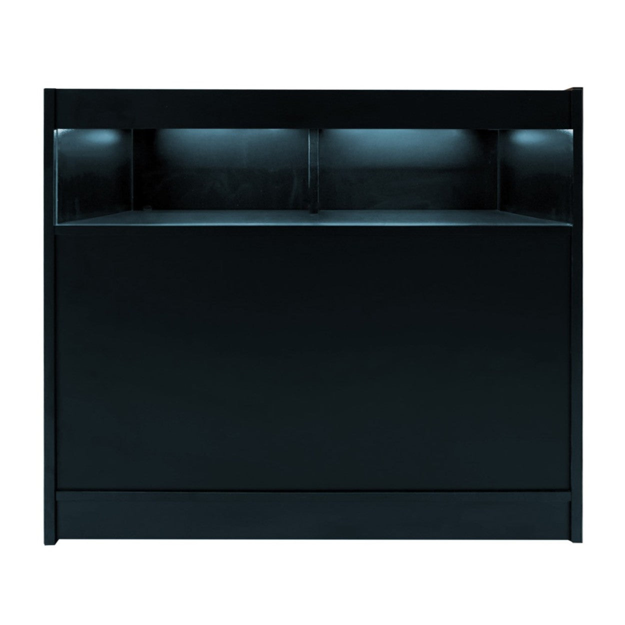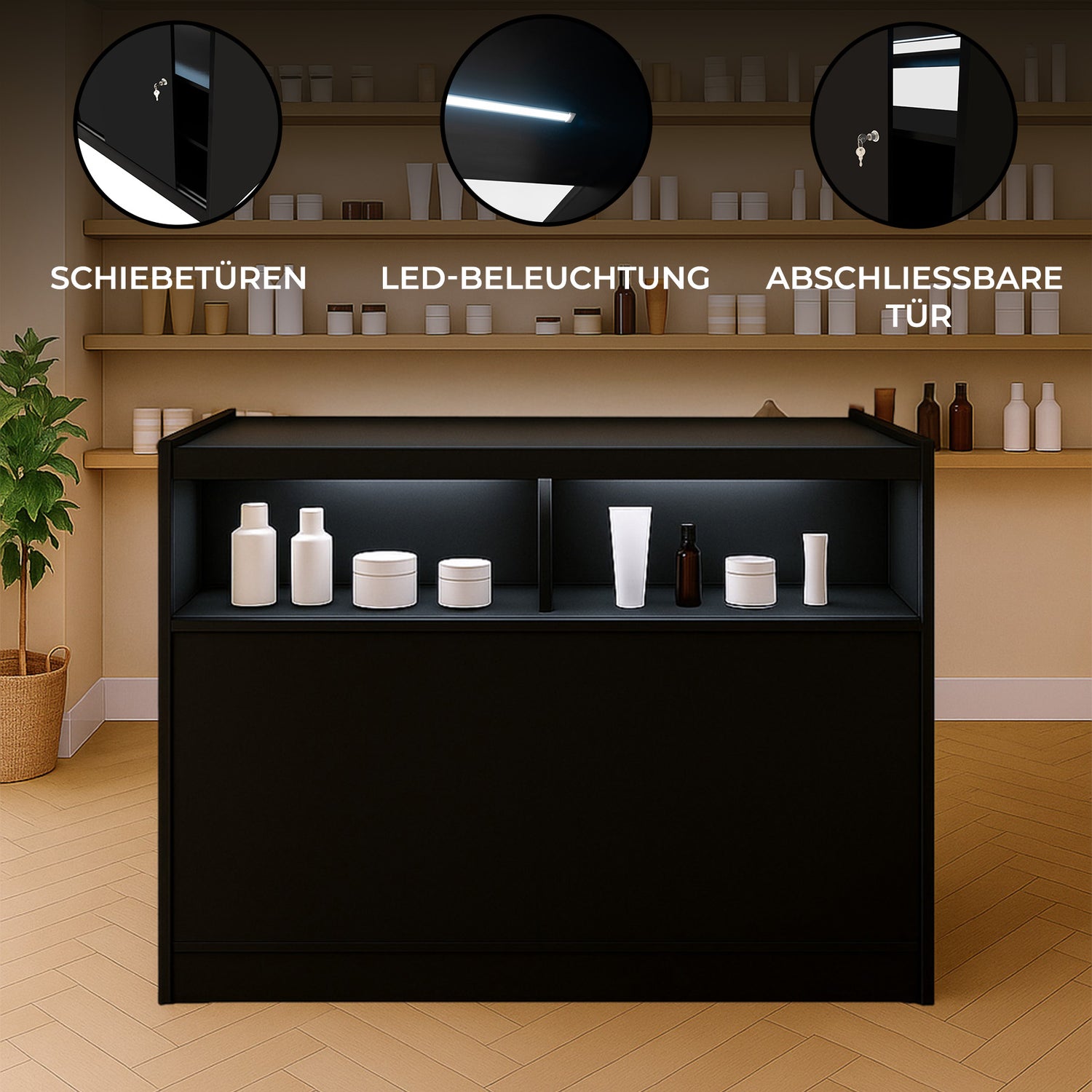 Gefertigt aus hochwertigem MDF mit robuster Melaminbeschichtung und gehärteten Glasplatten, ist die B1200 Theke für den dauerhaften Einsatz in stark frequentierten Verkaufsbereichen konzipiert. Die helle, weiße LED-Beleuchtung sorgt für einen klaren, professionellen Glanz, der Ihre ausgestellten Produkte auch bei schwacher Beleuchtung optimal zur Geltung bringt. Das schlichte, schwarze Äußere unterstreicht den hochwertigen Look und macht die Theke zu einem stilvollen Element in modernen und klassischen Ladendesigns.