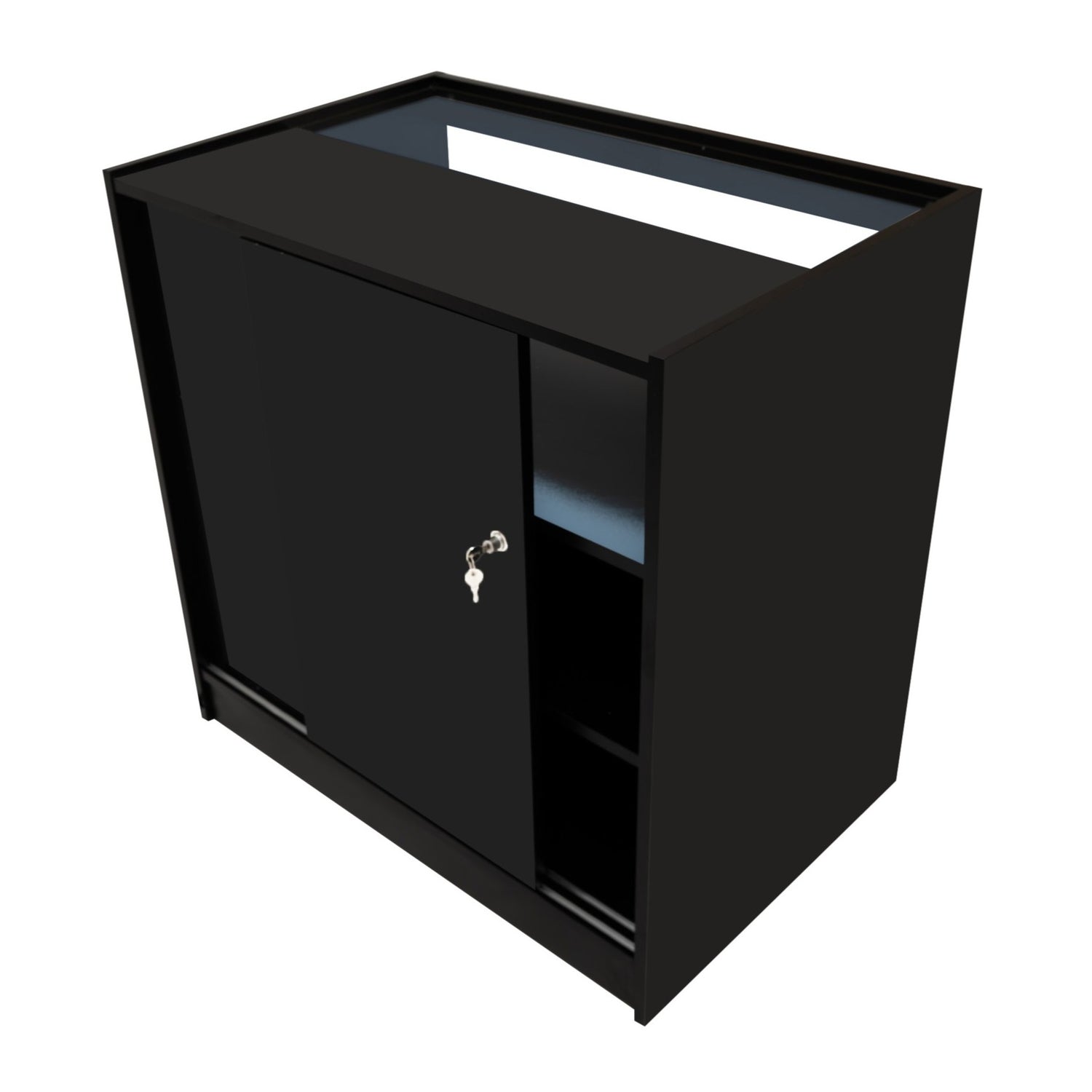 Funktionalität trifft auf Design: Die B900 verfügt über insgesamt drei Regalfächer – ein offenes Präsentationsregal zur Hervorhebung besonderer Produkte sowie zwei geschlossene Regale für die sichere Aufbewahrung weiterer Artikel. Die zwei abschließbaren Schiebetüren auf der Rückseite (inklusive zwei Schlüsseln) bieten geschützten Zugang zum Stauraum, ohne die aufgeräumte Optik auf der Kundenseite zu stören.