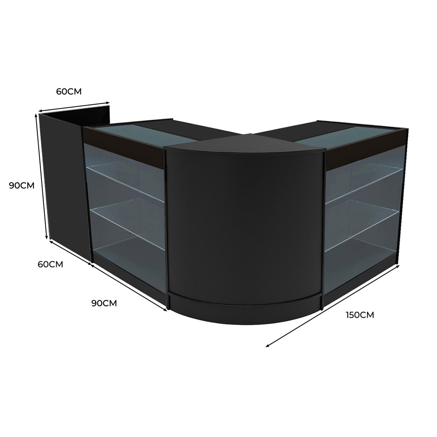 Alle Tresen bestehen aus hochwertigem MDF mit einer robusten schwarzen Melamin-Oberfläche, die für langanhaltende Leistung und ein gleichbleibend modernes Erscheinungsbild sorgt. Dieses gemeinsame Material und Finish schafft ein einheitliches Gesamtbild, während gehärtete Glaselemente im K900 für einen edlen Akzent in den wichtigsten Präsentationsbereichen sorgen.
