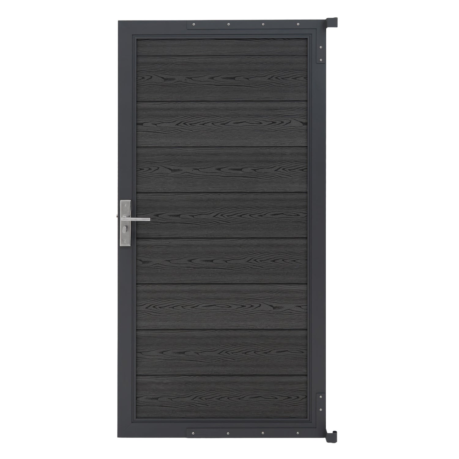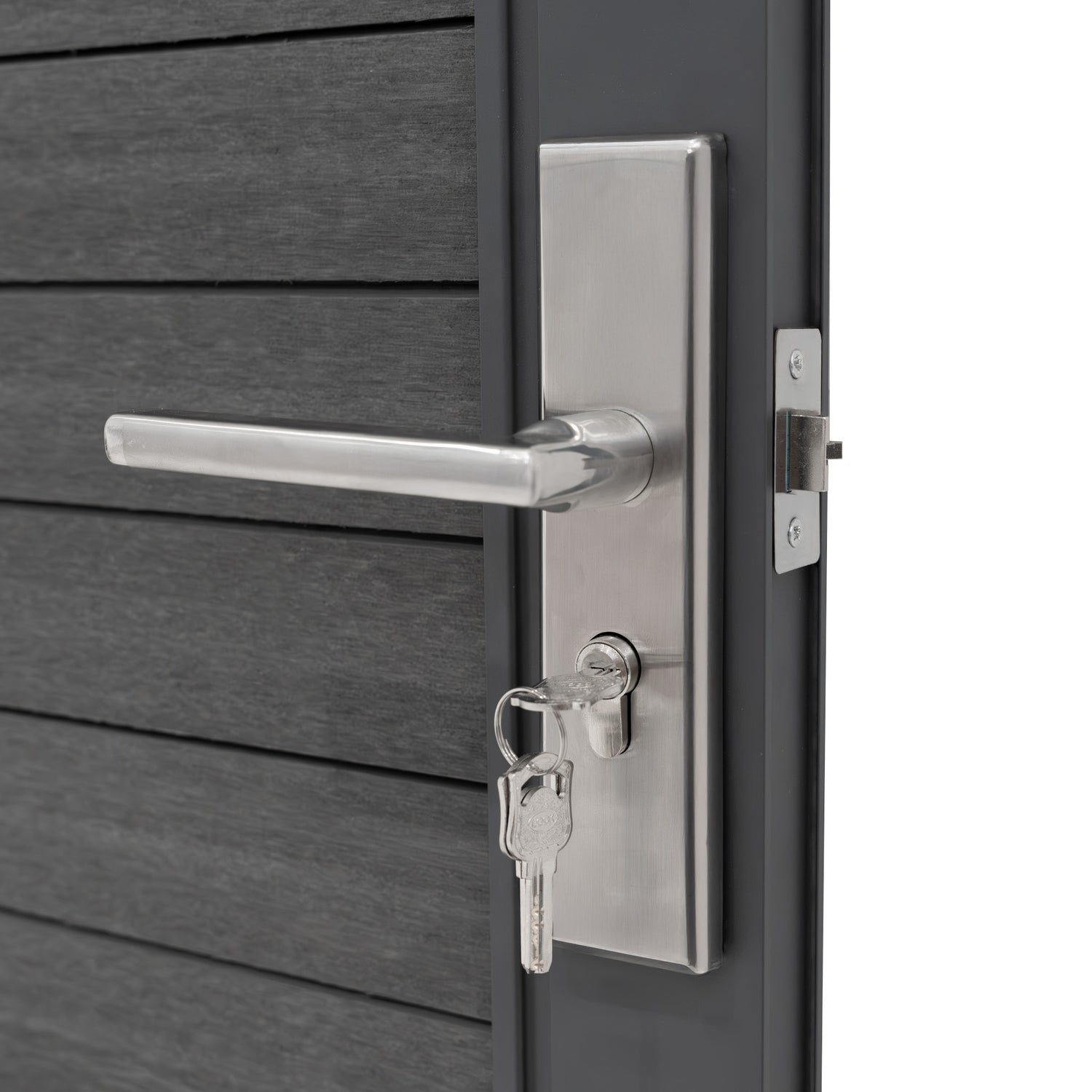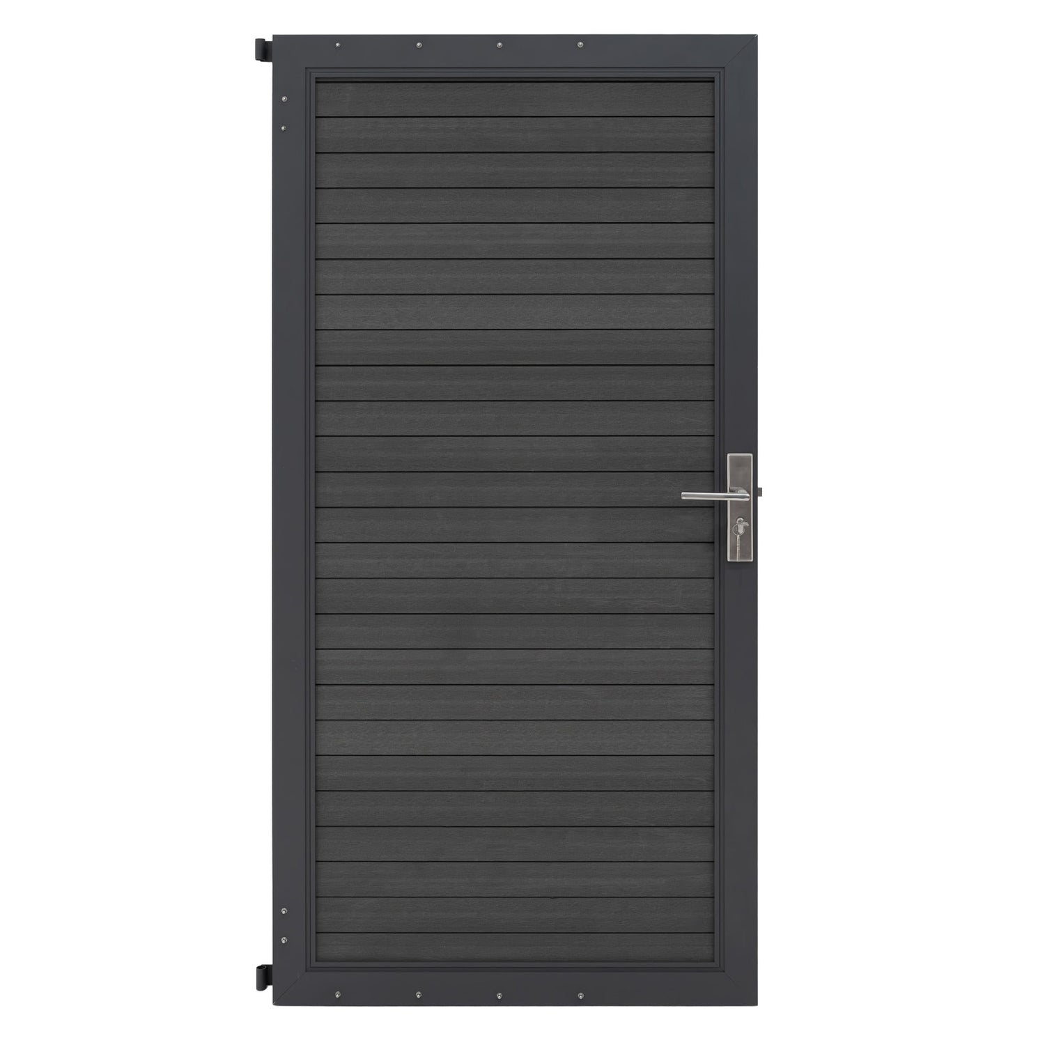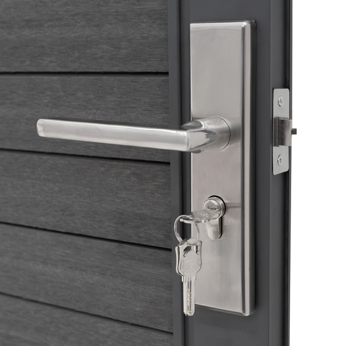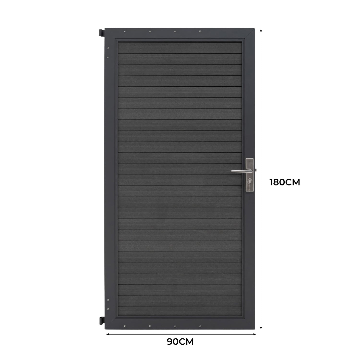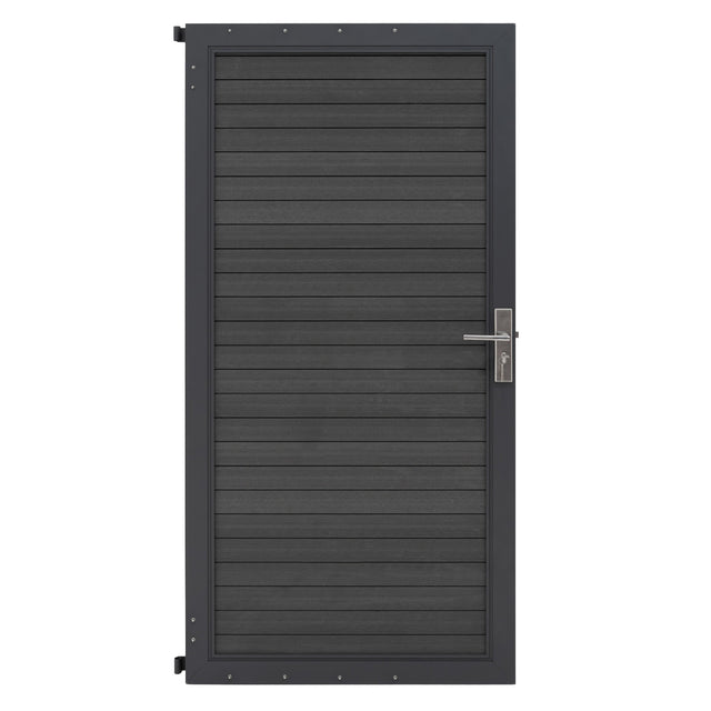 Bringen Sie einen Hauch moderner Raffinesse in Ihren Außenbereich mit diesem grauen Tor aus Verbundpaneelen, einer eleganten und praktischen Lösung zur Verbesserung von Privatsphäre, Sicherheit und Außenwirkung. Ob entlang einer Grundstücksgrenze, am Terrassenzugang oder an der Einfahrt: Dieses Tor bietet eine stilvolle, pflegeleichte Alternative zu herkömmlichem Holz und fügt sich harmonisch in jedes moderne Umfeld ein.