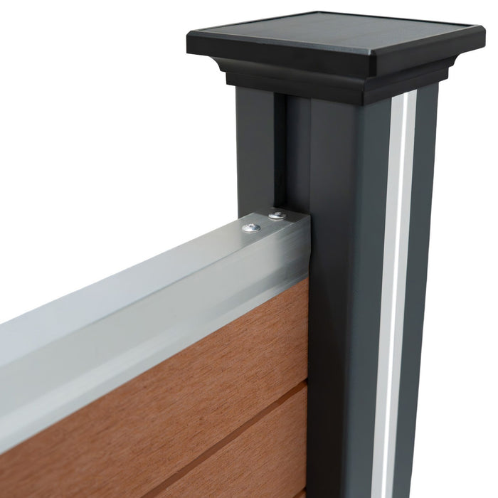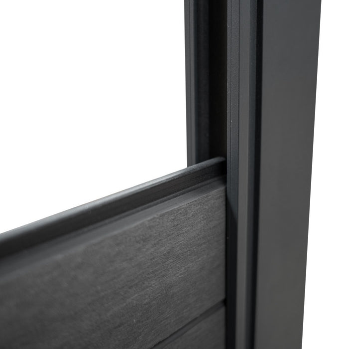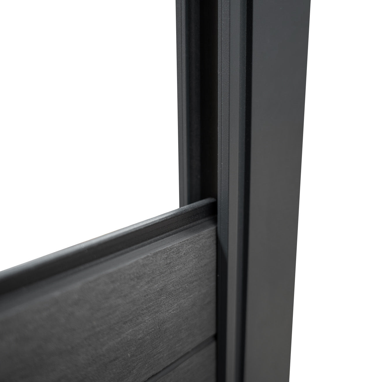 Präzise gefertigt aus hochwertigem WPC und verstärkt mit einem robusten Aluminiumrahmen, vereint das Tor ästhetische Eleganz mit struktureller Stabilität. Es besteht aus neun ineinandergreifenden Lamellen, die ein solides, zuverlässiges Torpaneel bilden, das seine Form und Optik dauerhaft beibehält. Der Aluminiumrahmen sorgt nicht nur für zusätzliche Festigkeit, sondern verfügt über eine vielseitige Befestigungslösung, die durch die vorgebohrten Fixierpunkte eine einfache Montage an unterschiedlichen Pfosten oder bestehenden Strukturen ermöglicht.