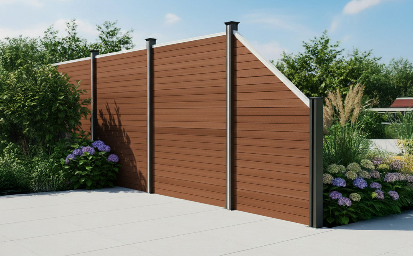 Bestehend aus neun passgenau ineinandergreifenden WPC Lamellen in Kombination mit stabilen Aluminium Pfosten überzeugt dieses Zaunsystem durch hohe Standfestigkeit und lange Lebensdauer. Die ausgewählten Materialien sind pflegeleicht, witterungsbeständig und sorgen dauerhaft für ein gepflegtes, edles Gesamtbild.