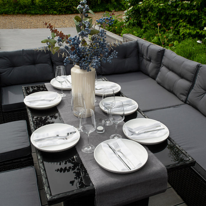 Die Garnitur ist in einem auffälligen Schwarz gefertigt und mit extra dicken, grauen Kissen ausgestattet, die Ihrem Garten einen modernen und luxuriösen Touch verleihen. Dank der zusätzlichen UV-Schicht können Sie sicher sein, dass Ihre Möbel das ganze Jahr über vor Wind und Wetter geschützt sind und so ihre schöne Farbe behalten.
